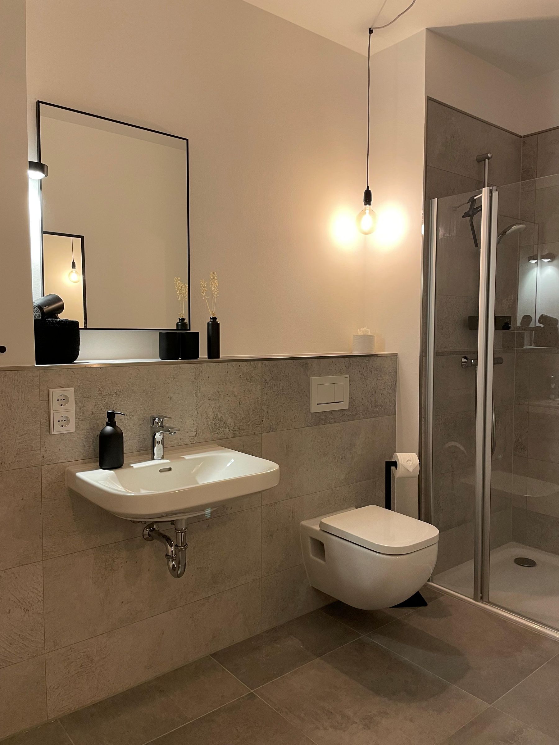 Das moderne Badezimmer mit Fußbodenheizung und Dusche bietet ausreichend Ablagemöglichkeiten für deine persönlichen Kosmetikprodukte. Handtücher, einen Haartrockner und Körperpflegeprodukte bekommst du von uns gestellt.