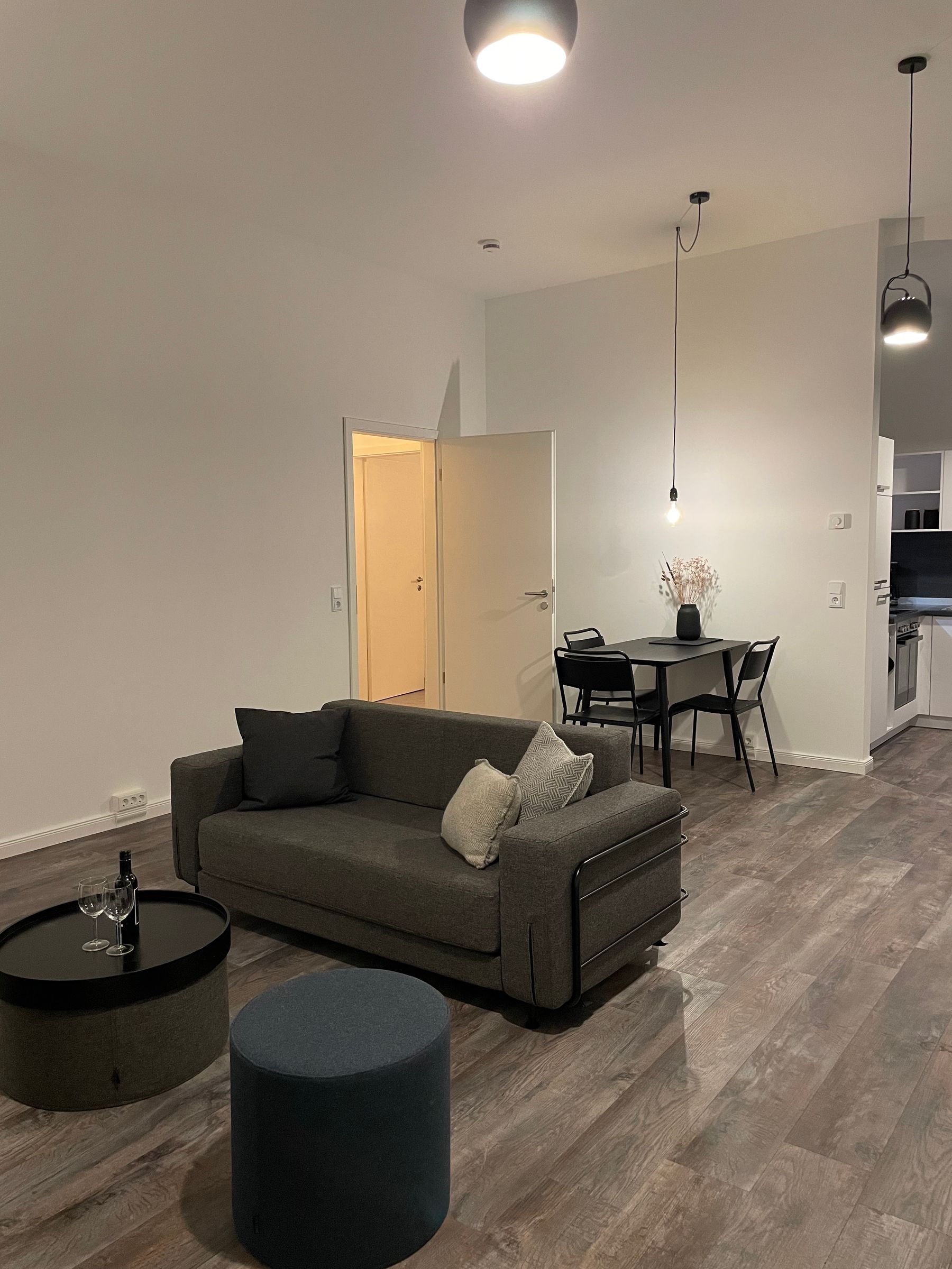 Der großzügige Wohn- und Essbereich ist mit einem Sofa sowie einem Esstisch (120 cm x 70 cm) ausgestattet. Für einen gemütlichen…